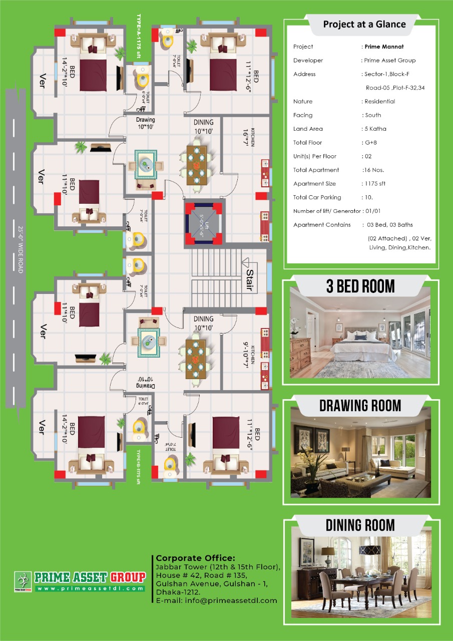 Apartment Contains : 03 Bed, 03 Baths ,(02 Attached) , 02 Ver, Living, Dining,Kitchen.
