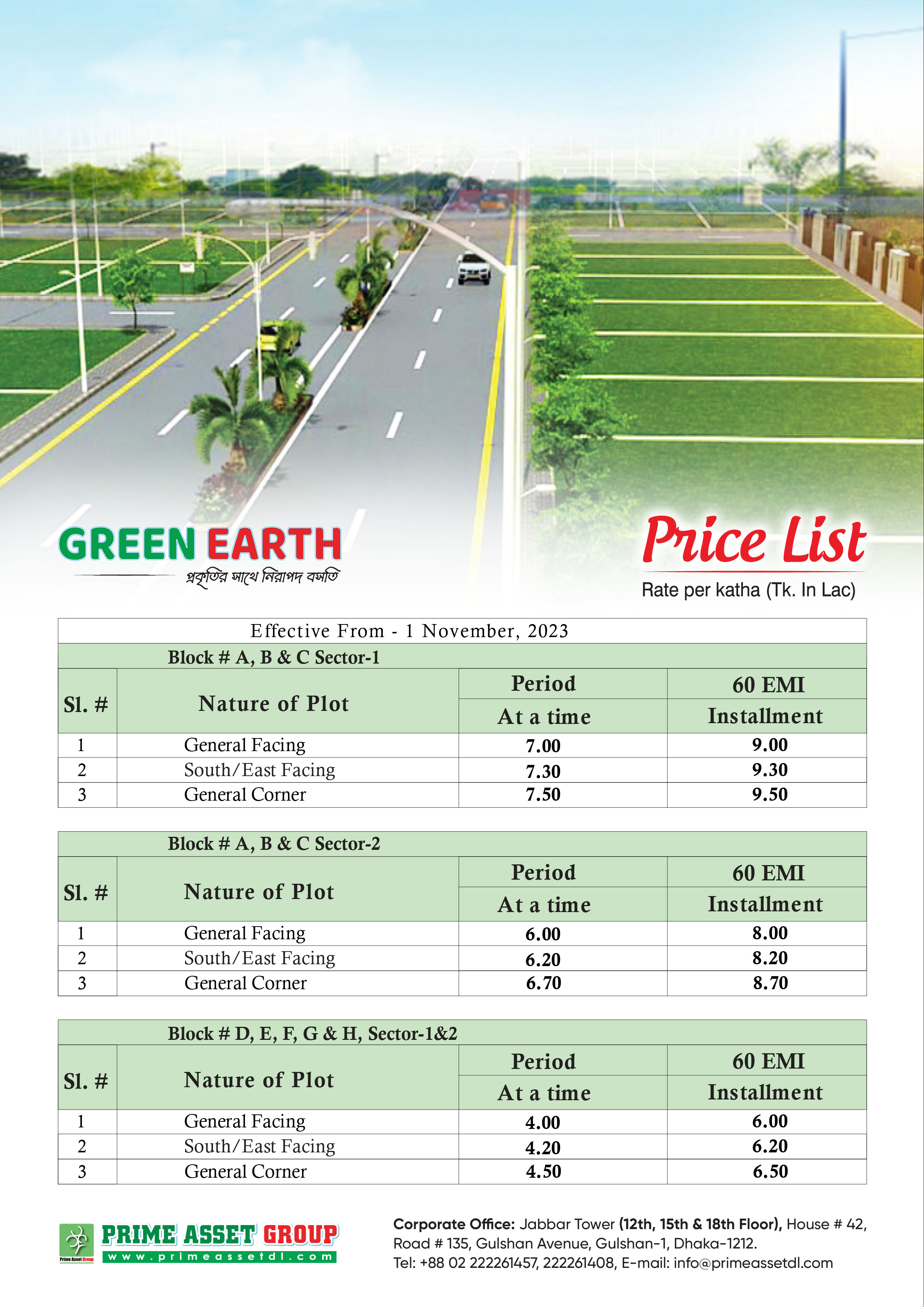 “Green Earth” is a safe settlement with nature. Your green city is coming up near Rajuk Megacity, “Purbachal New Town”, just like Dhaka but not far from it. It is like a new-generation Dhaka, which is only 25 minutes from Hazrat Shahjalal International Airport and only 20 minutes from Kuril Flyover. We are telling the story of Green City. "Purbachal New Town" has the Prime Minister's Office, foreign embassies, country offices of the World Bank, a modern cricket stadium with a capacity of millions of spectators, an international trade fair, Bangabandhu Tri-Tower and many other important buildings near our "Green Earth" project. As all these important places in Purbachal are close to the project, its value will increase manifold in the next 5 years. Therefore, "Prime Asset Group" is developing a modern and well-planned housing project "Green Earth", near Sectors 21 and 22 of "Poorbachal New Town". You can also be a proud partner of the project by buying a plot in “Green Earth”.